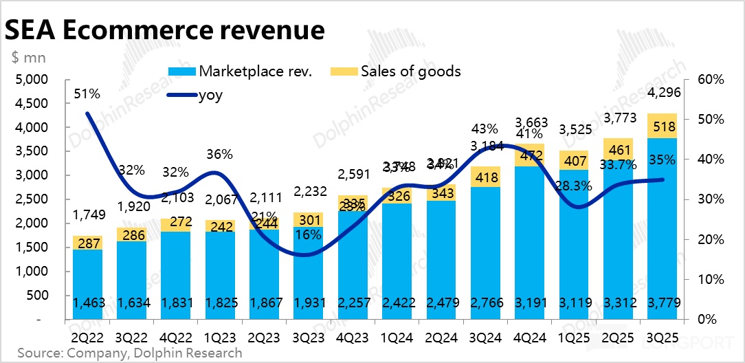 强劲的 GMV 增长,以及继续走高的 take rate,本季 Shopee 总营收同比增长 35%,环比再度提速。其中平台型收入的增速更高达 37%,环比提速了整 3pct。