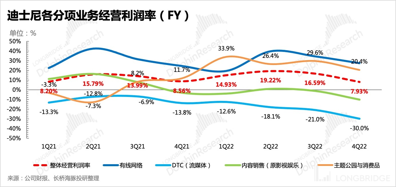 迪士尼管理层提出,即将迎来流媒体亏损拐点,这基本符合核心投行的预期,即四季度的亏损程度是最高点,随后是逐步改善,直到 2024 年流媒体实现盈利。但海豚君认为,在此之前迪士尼因为收入结构的变化,整体盈利能力的走弱也很难避免。