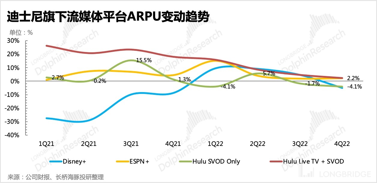 单用户价格 ARPU 被汇率和捆绑价有所削弱,但涨价的 ESPN+ 环比提升。