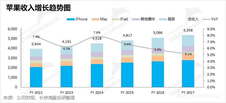 海豚君测算,苹果未来五个财年的收入端仍将保持个位数的复合增长,苹果总收入至 2026 年将有望突破 5000 亿美元。