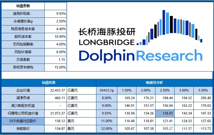 而在中性判断下,当海豚君在 DCF 估值中将无风险收益率上调到 4%(对应 WACC 为 9.93%),则对应公司 DCF 估值为 2.2 万亿美金总市值,对应每股 138 美元,和当前股价(146 美元/股)未见明显空间。