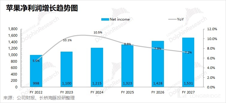 海豚君测算,苹果未来五个财年净利润也仍将保持个位数的复合增长,苹果的净利润至 2027 年将有望突破 1500 亿美元。