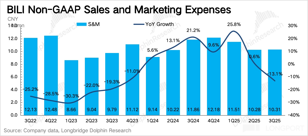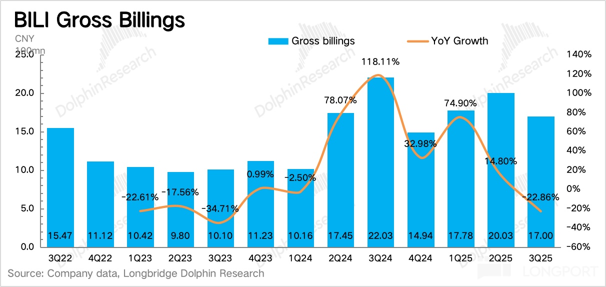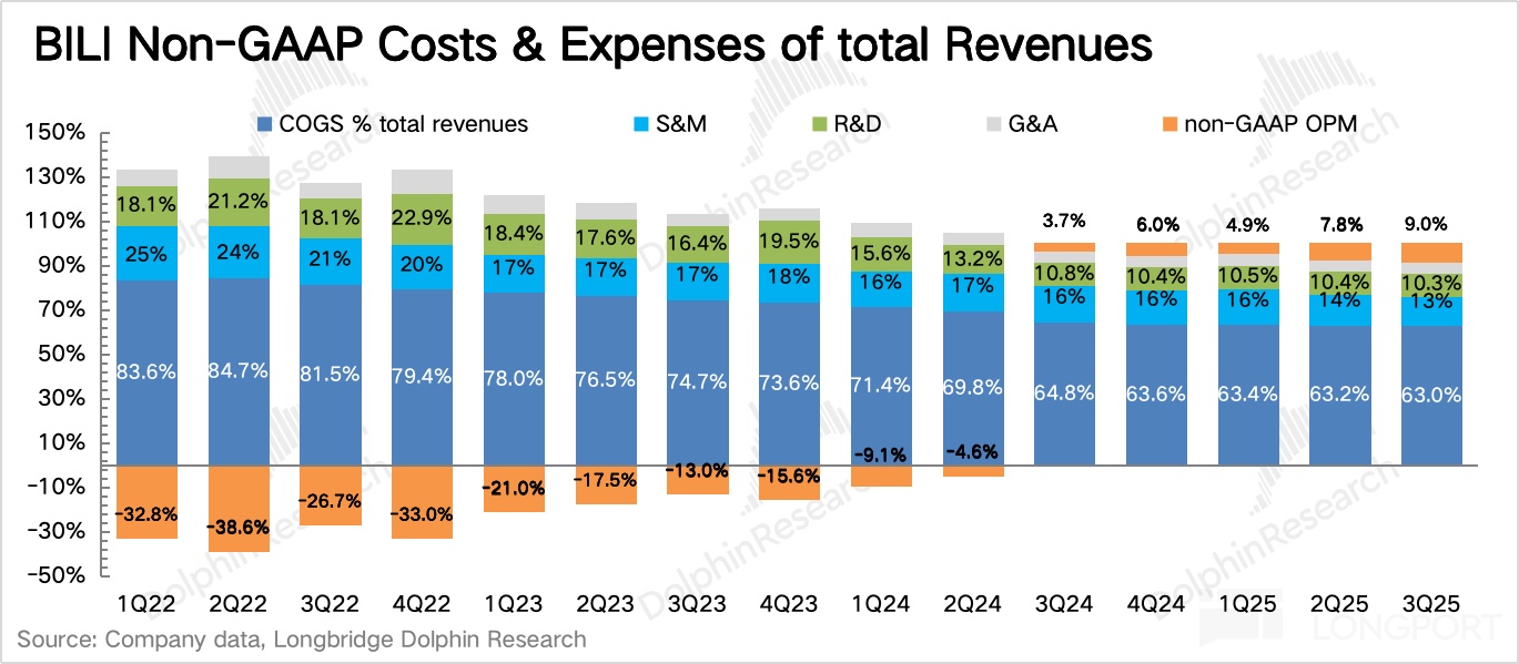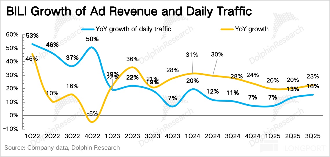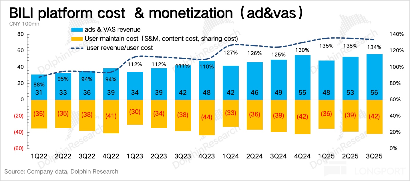 三季度 B 站广告收入超 25.7 亿,同比增长 22%,高于指引和预期。广告增长主要受益生态内用户时长增加(+16%yoy),以及公司对广告算法、投放系统与 AIGC 创意工具的升级。其中,超过 50% 的广告素材已通过 AIGC 自动生成,显著提升制作效率与转化效果。