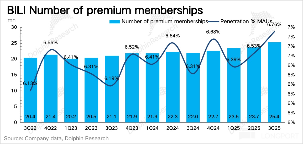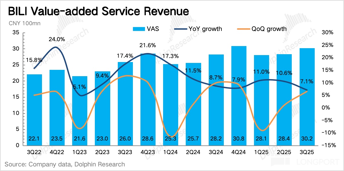 直播 + 大会员订阅为主的 VAS 增值服务收入,三季度同比增长 7%,环比增速显著放缓。