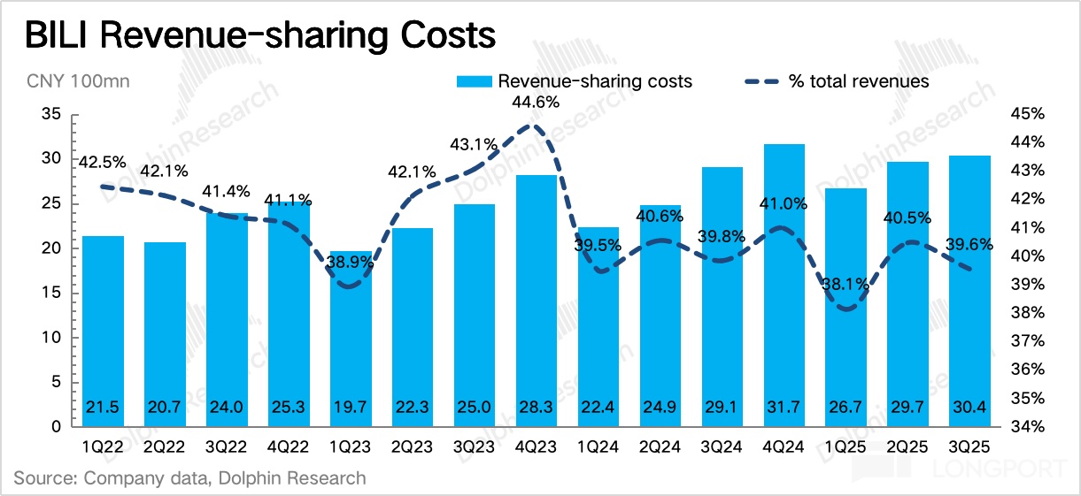 具体成本结构,收入分享成本占大头,主要与游戏、直播、花火广告有关。三季度收入分享成本继续增长到 30.4 亿,随着游戏下降,增速也显著放缓到 4%。
