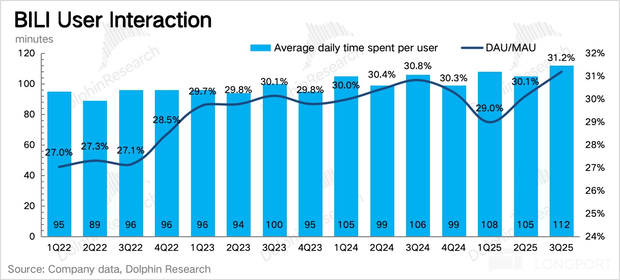 粘性指标同步在改善,DAU/MAU 环比提升至 31%,用户时长达到 112 分钟创纪录,同比增加 6 分钟。