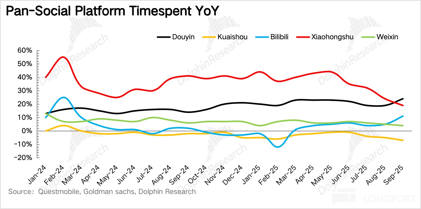 放眼社交平台行业,根据 Questmobile 追踪的平台用户总时长增速数据,三季度,B 站和抖音增速趋势向上,小红书增速开始显著放缓,快手下滑幅度加大。