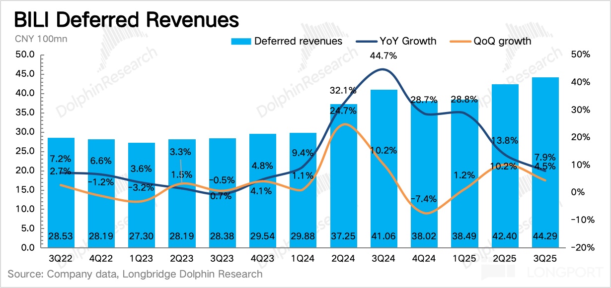 2. 游戏短期仍承压:因为《三谋》之后没有同级别的新游接力,下半年开始进入高基数带来的承压期。本季度下滑 17%,实际压力略超预期。从递延收入看(同比增长显著降速、计算得流水同比下滑),显然四季度以及明年一季度还会受到同等压力,公司预计明年下半年的 pipeline 才会相对丰富。