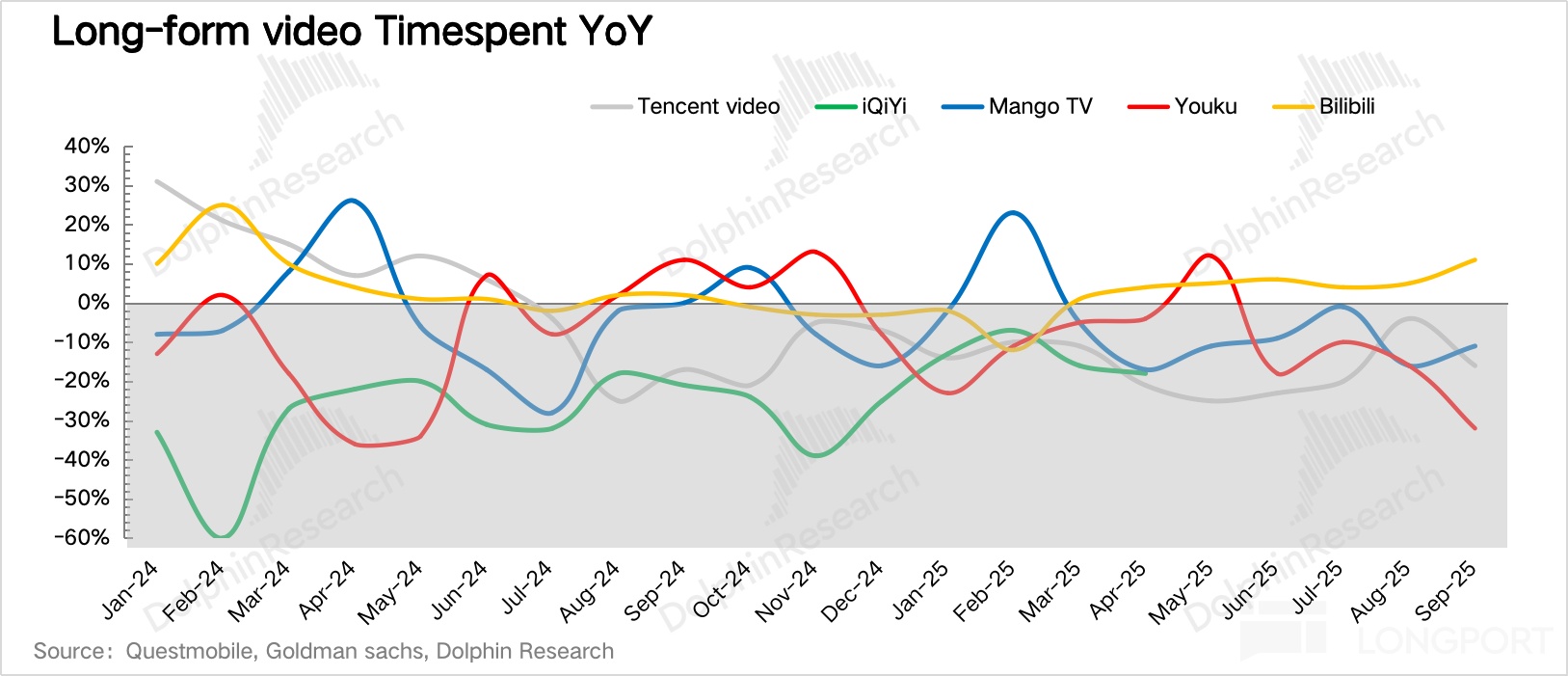 虽然在社交平台中时长没优势,但对比传统长视频平台,B 站还是吊打的。三季度,B 站出了本身的动漫内容外,自制综艺《去你家吃饭好吗》第三季、纪录片《守护解放西 6》以及 9 月末上线的古装复仇爽剧《金昭玉醉》,均吸引了不少新增订阅。因此,行业中除了 B 站之外的长视频平台仍徘徊在 “水下”。