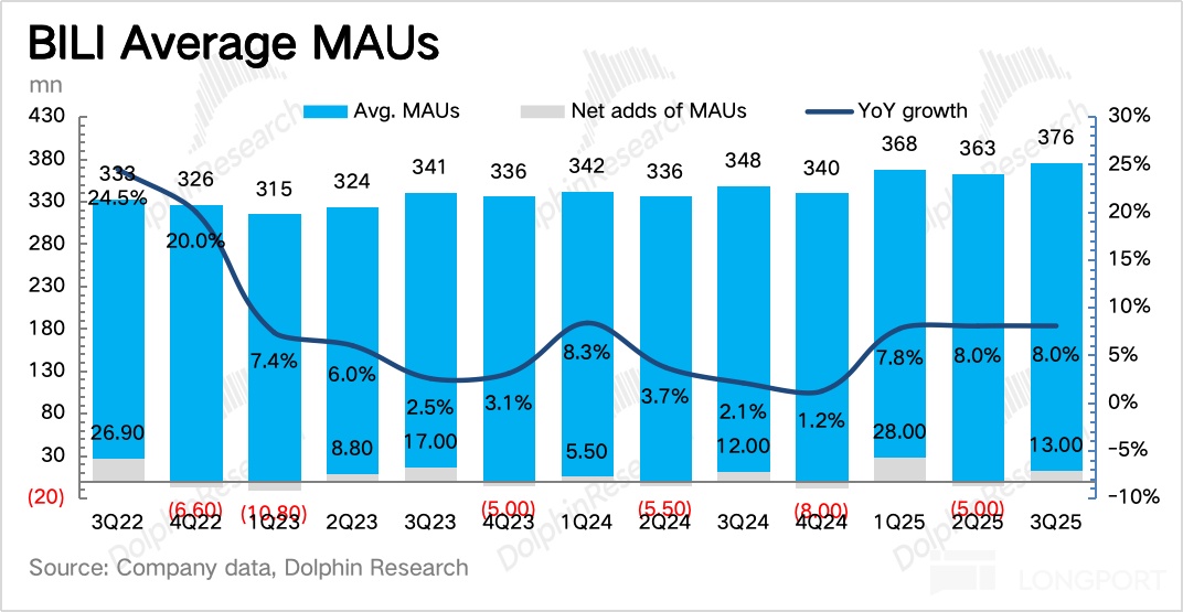 1. 用户生态健康扩张:这是海豚君认为的财报最大亮点。Q3 是暑假旺季,B 站月活 MAU 环比净增 1300 万人,DAU/MAU 提升至 31.2%。B 站生态的重新扩张从年初开始,去年因为 MAU 增长放缓,公司一度不再明列 MAU 指标,并引导市场关注 DAU。但今年从受益春晚转播权开始,生态迎来了新的一波健康回暖——生态扩张的同时,粘性(DAU/MAU、日均用户时长)也在提升。
