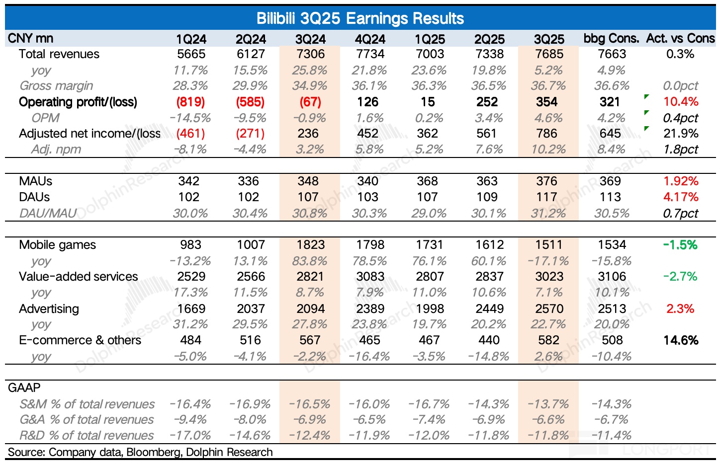 北京时间 11 月 14 日港股盘后,$哔哩哔哩(BILI.US) 发布 2025 年三季度财报,整体看小超预期,亮点在广告收入、利润和用户指标,游戏和直播则相对不佳。财报后当天市场反应平淡,主要还是大盘影响,此外部分资金可能介意短期指引惊喜不足。