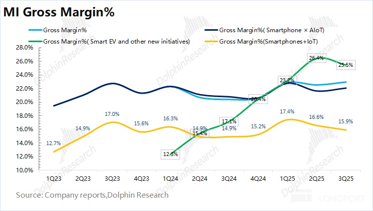 毛利率提升至 22.9% 的相对高位,主要是受到了汽车业务占比提升带来的结构性支撑,而手机业务的毛利率受竞争加剧影响有所下滑。