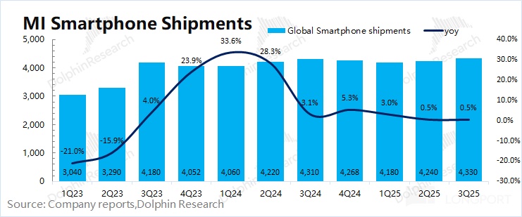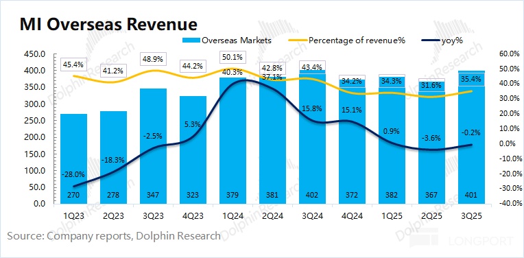 2025 年第三季度小米海外收入 401 亿元,同比下滑 0.2%,此前受国内市场国补政策及小米汽车突破的情况下,公司把重心主要放在国内市场,海外市场收入占比下滑至 35% 左右。
