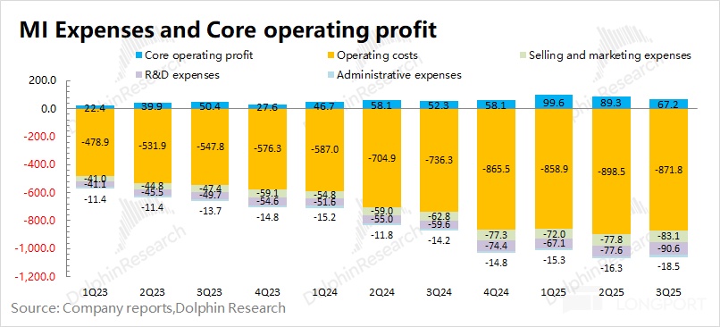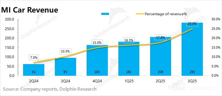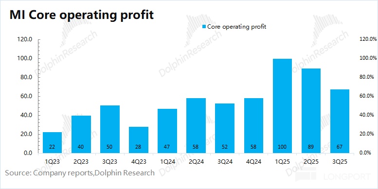 本季度汽车业务毛利率继续提升至 25.5%,市场预期(25.6%)。不过环比上季度小幅下滑,主要是高毛利率的 SU7 Ultra 占比减少。海豚君测算本季度小米汽车业务核心经营利润为 6.8 亿元(财报中披露的 11 亿,剔除了 4 亿元的股权激励相关费用),首次实现盈利。