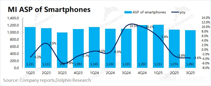 分市场来看:①国内市场,在国补收紧的情况下,小米手机在国内市场份额同比下滑至 14.6%,受市场竞争加剧的影响;②海外市场,小米手机同比增长 2.7%,海外市场份额同比持平。