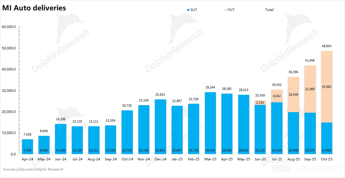 小米 10 月的汽车交付量已经提升至 4.86 万辆,环比于 9 月又增长了 6000 多辆,受益于公司此前的积压订单和二期工厂的爬坡,这主要体现了小米汽车过往的订单表现。
