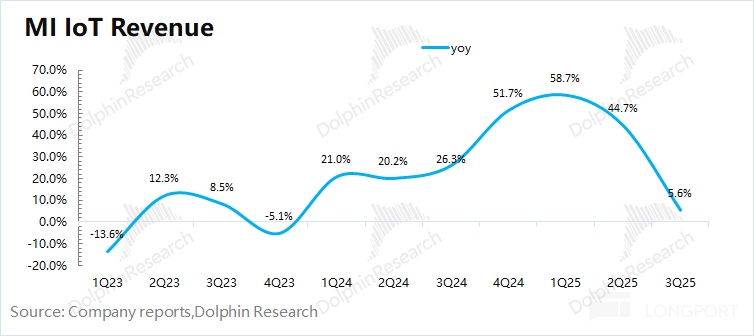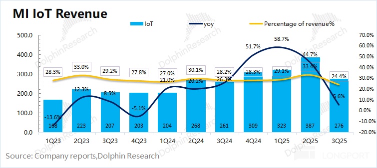 2025 年第三季度小米 IoT 业务实现营收 276 亿元,同比增长 5.6%。受国补退坡的影响,IoT 业务中的大家电品类出现两位数的下滑,直接影响了 IoT 业务的增速表现。