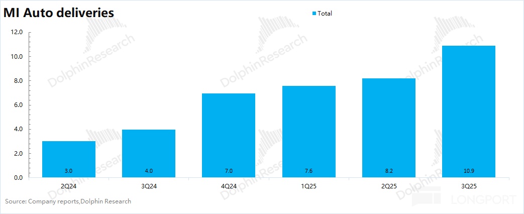 2.汽车业务:$小米集团(ADR)(XIACY.US) 本季度汽车相关收入 290 亿元,基本符合预期。其中公司本季度汽车出货量 10.9 万台,单车均价进一步提升至 26 万元。主要是受价格相对较高的 YU7 出货增加,结构性带动汽车均价的提升。
