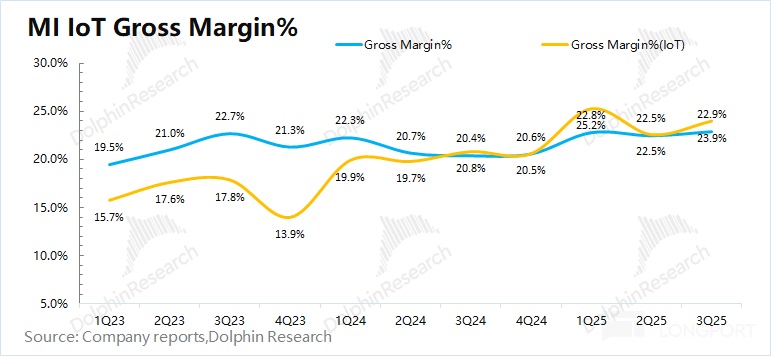 本季度 IoT 业务的毛利率 22.9%,环比提升 0.4pct,受毛利率较高产品(如可穿戴产品等)占比提升的带动。