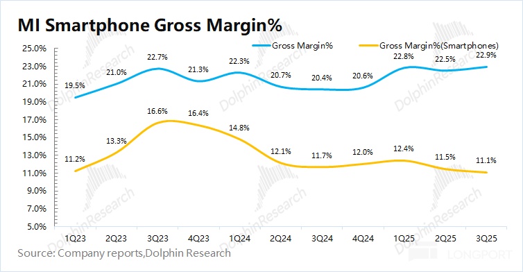 小米集团 2025 年第三季度毛利率 22.9%,市场预期 22.7%。其中本季度手机业务毛利率在本季度再次下滑,汽车是毛利率提升的最大贡献项。