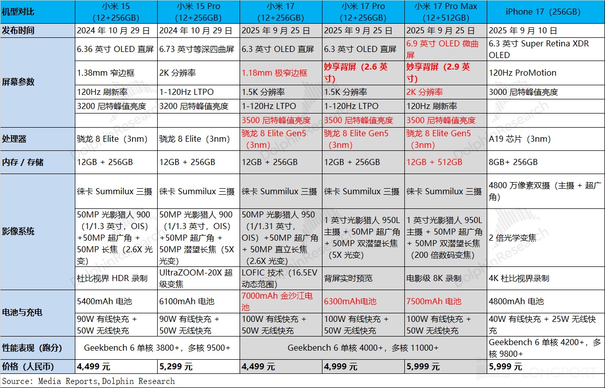 换句话说,苹果 17 新品(256G)叠加国补后价格在 5499 元,拉近了与小米旗舰机型之间的价格差距,而小米本次并未给出更具吸引力的价格。