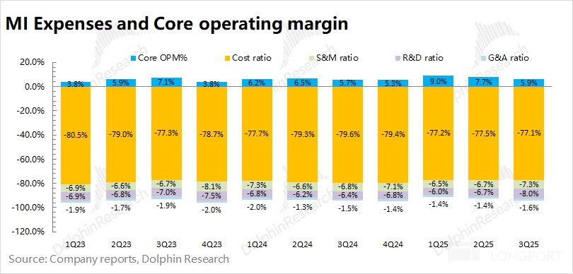 本季度公司实际的核心经营利润 67 亿,核心经营利润率为 5.9%,主要是受手机毛利率承压及费用端增加的影响。
