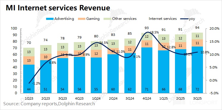 2025 年第三季度小米互联网服务业务实现营收 94 亿元,同比增长 10.8%。本季度主要的增长驱动还是在广告上: