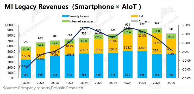 1)原本的业务——手机 X AIoT 业务(传统业务)实现营收 841 亿元,同比增长 1.6%。其中硬件业务表现较弱,手机业务同比继续下滑,IoT 业务增速回落至个位数;