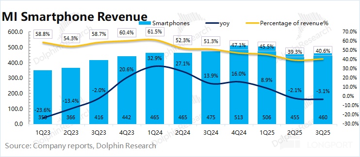 2025 年第三季度小米智能手机业务实现营收 460 亿元,同比下滑 3.1%,主要受国补收紧和竞争加剧的影响。