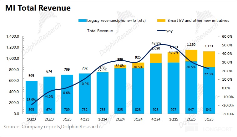 小米集团 2025 年第三季度总营收 1131 亿元,同比增加 22.3%,市场预期 1125 亿元,公司本季度增长主要来自于汽车业务。