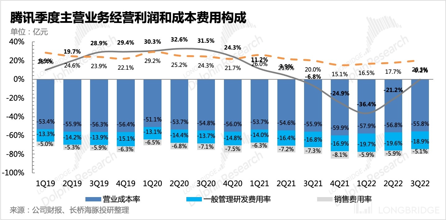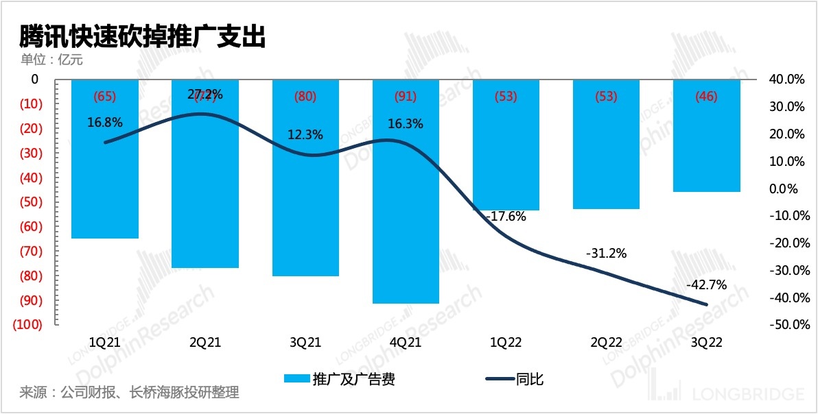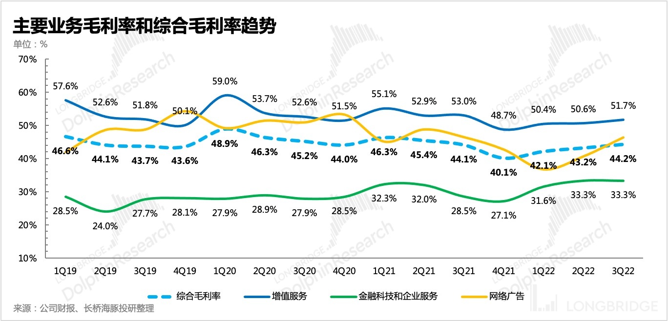 (5)数字内容整个板块都处于业务收缩和优化利润模型的状态,因此收入下滑在所难免。昨天发布财报的腾讯音乐,压力主要在直播、K 歌的付费需求减弱上。腾讯视频的付费用户数三季度也环比流失了 200 万,但这一块的整体利润因此内容成本增长放缓、直播分成减少,而有了一些改善。三季度增值服务的毛利率环比上升了 1 个百分点。