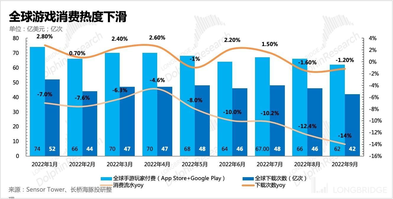三季度网络游戏收入 429 亿元,同比下降 4.4%。全球的游戏市场都处于寒冬(《游戏的凛冬已至,何处有暖春?》),三季度无论是中国本土市场、中国游戏企业出海还是全球游戏市场,都在加速下滑阶段,寒气逼人。因此要走出需求低迷的行业逆风趋势,只有靠更丰富的产品线来跨越周期。