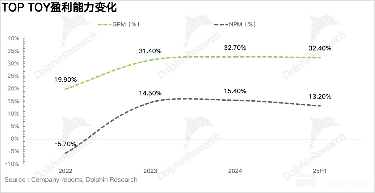 但弊端也很明显,过度依赖外部 IP 会导致 Top Toy 只是一个渠道品牌。版权方为了实现利益最大化,往往会将同一个 IP 授权给多个厂商,由于 IP 二创这个环节在海豚君看来差异并不大,这也导致市场上最终的产品同质化较为严重,最终也就使得 Top Toy 的盈利能力并不高,从下图可以看到 TOP TOY 的毛利率基本稳定在 30% 左右,远低于泡泡玛特 70% 的超高毛利率。