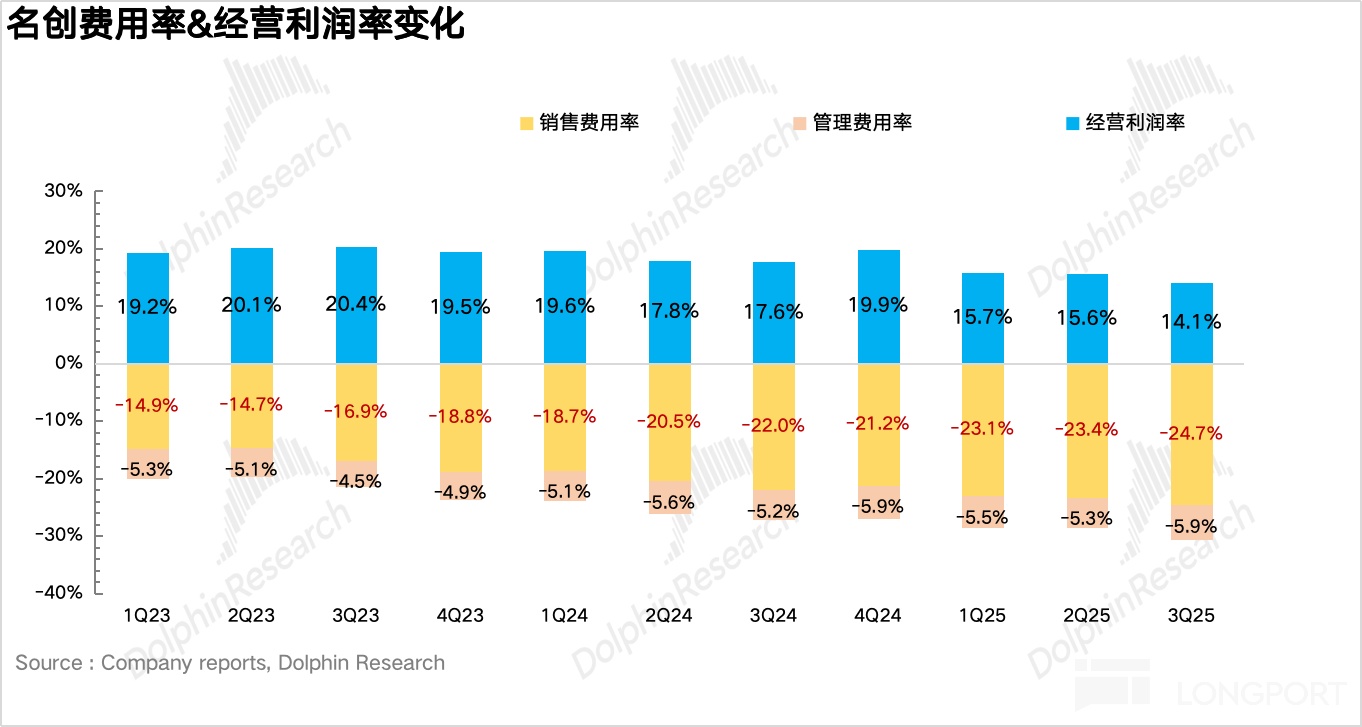 4、费用投放加大,利润释放不及预期。费用投放上,由于当前阶段名创仍处于海外(尤其是北美地区)的业务扩张阶段,面临大量的开店、人员招聘、品牌投放等前置性投入,三季度销售费用&管理费用率均有所提升,最后经调整净利润达到 7.7 亿元,小幅不及市场预期(8.1 亿元)