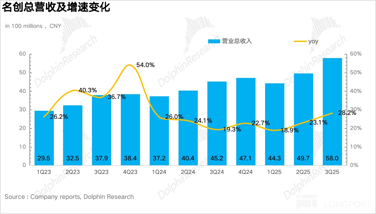 3Q25 名创集团层面实现总营收 58 亿元,同比增长 28.2%,小幅超过公司此前 25%-28% 的指引上限。