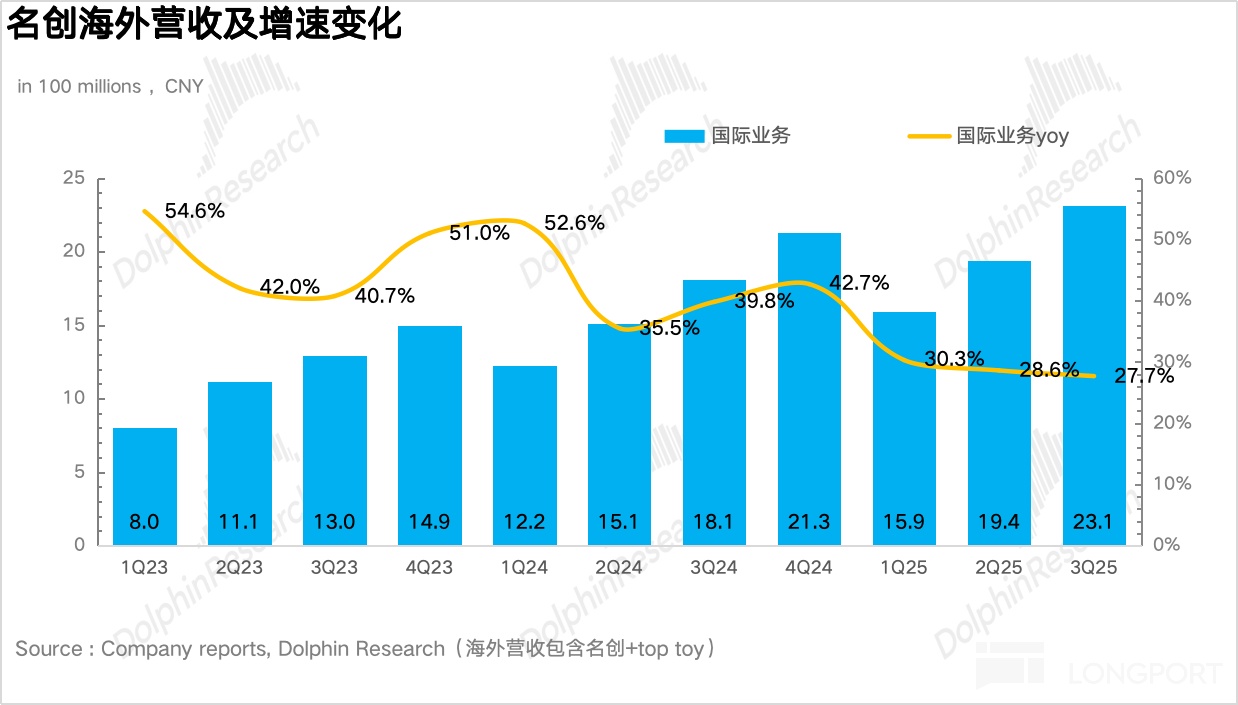 总体上,三季度海外实现营收 23.1 亿元,同比增长 27.7%,趋势上看环比稍有降速,核心在于去年同期基数较高(芭比 Barbie、马里奥等现象级 IP 在去年三季度爆火)。
