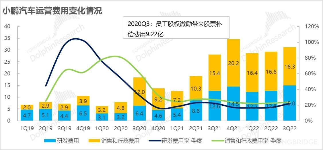 4、费用刚性、销量不济,经营利润率失守:这次虽然汽车毛利率改善之下带动了整体毛利率的回升,但是由于研发费用和销售费用都在持续高增长,尤其是研发费用还是在每个季度都节节攀升的状态;而销售费用上小鹏仍然直营 + 经销双模式,收入放缓但开店持续推进中,导致费用也比较刚性,稍微销售费用上小幅无法抵消店面扩张、新车宣发带来的费用增长,导致费用率的下降只能靠规模的销量释放来稀释,但是这个季度销量疲软,导致经营亏损率进一步拉大,比上海疫情影响下的二季度还严重。
