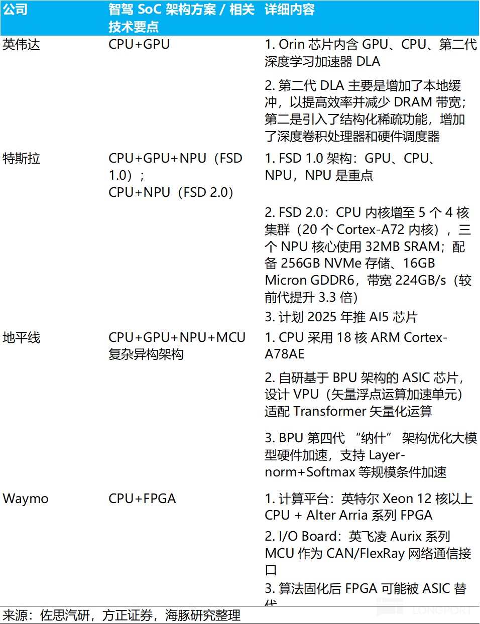① 垂直一体化玩家:特斯拉和华为。特斯拉采用自研自用的垂直整合模式,很早就自研芯片,华为也为 “智选车”+“HI 模式” 下的车企提供软硬一体化的智驾方案。