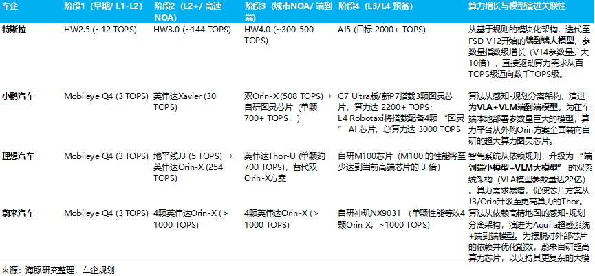 智驾进阶、端到端大模型上车,智驾模型的参数量呈指数级增长,现在城市 NOA 主流方案算力需求已攀至近 500 TOPS,这通常是高速 NOA 的 4-5 倍。而实现 L3-L4 自动驾驶,则需要跨越式的算力支撑。