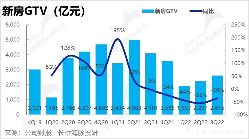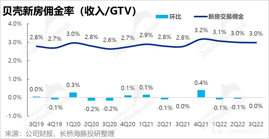 对比行业大盘,海豚君跟踪的主要城市二手房成交面积在三季度环比增长了近 18%,而贝壳是环比增长 14%,可见贝壳存量房业务的反弹力度甚至还略不及大盘。(需要注意行业数据是成交面积而非成交额,并未虑房价变动的影响)。因此总的来看,贝壳的存量房 GTV 虽已触底反弹,但复苏的力度并没有行业大盘数据和市场预期的那么好。