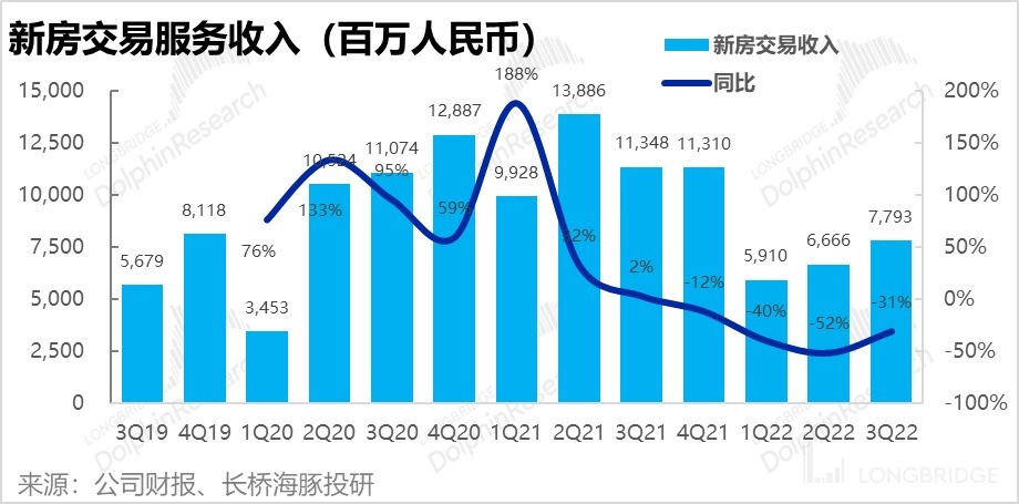 新房业务延续了先前收紧合作对象,成交规模萎缩高于行业的趋势。本季实现新房成交额 2615 亿元,同比萎缩了 36%,高于百强房企同期销售金额下降 33% 的幅度。同时本季度末公司的应收账款为 48.9 以元,相比上季度的 56.9 亿继续减少,坏账风险明显也在下降。不过好在市场新房成交规模已基本企稳(虽然是在谷底),贝壳本季的新房佣金率同样止跌,最终新房业务本季收入 77.9 亿元,同比减少了 31%,与市场预期一致。