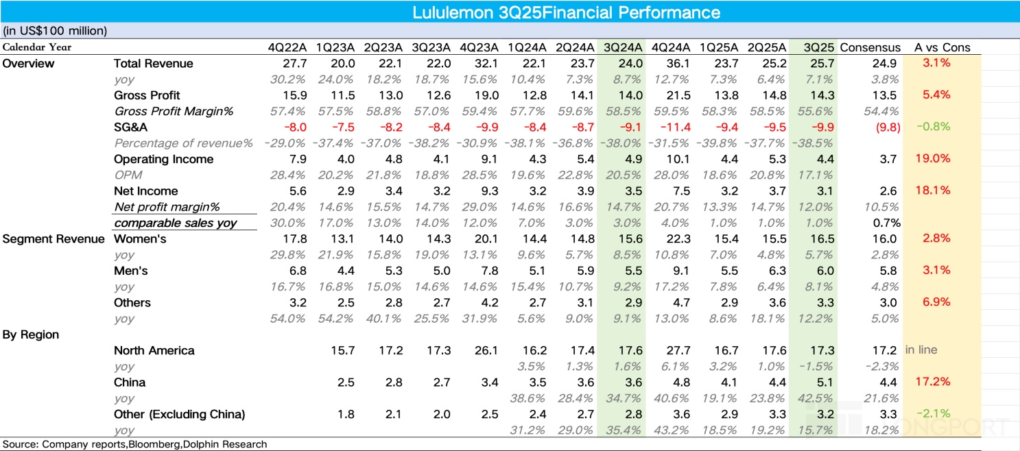 1、营收超出市场一致预期。3Q25Lululemon 实现营收 25.7 亿美元,同比增长 7.1%,由于国际市场的强劲增长,公司总体业绩增速并没有出现上个季度指引的进一步下滑(指引为 3%-4%),趋势上和前两个季度增速持平。