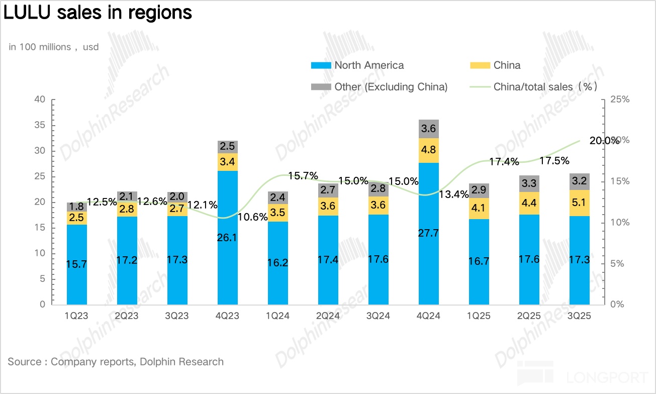3Q25 男装实现营收 6 亿美元,同比增长 8.1%,占整体业务比例较去年同期几乎没变化。从近期的动作上看,产品方面,Lululemon 针对男性用户 “怕出汗显痕迹” 的痛点,推出了 ShowZero 系列 Polo 衫,主打外侧无汗渍,切入男性商务休闲和高尔夫场景,并对核心的 Metal Vent Tech(高性能训练)和 Zeroed In(轻量速干)系列进行迭代,进一步改善透气性和舒适度。但整体上,目前男装仍处于从依赖经典款向新品驱动转型的过渡期,结合公司电话会信息,Lululemon 要在 2026 年春节期间把新品占比从当前 23% 提升到 35% 左右。