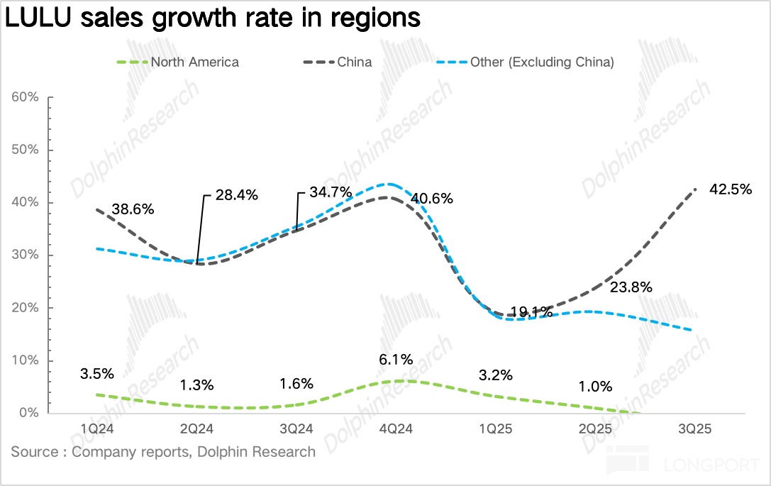 3Q25Lululemon 实现营收 25.7 亿美元,同比增长 7.1%。由于国际市场的强劲增长,公司总体业绩增速并没有出现上个季度指引的进一步下滑(指引为 3%-4%),趋势上和前两个季度增速持平,属于中规中矩的表现。