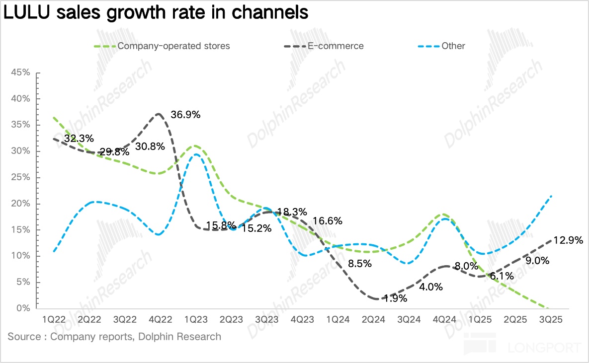 从同店营收增速看,除了中国地区明显提速外,其他地区并没有太多改观。从渠道上看,线上的增速达到 13%,环比持续提速,远高于线下门店的增速,海豚君推测核心在于 Lululemon 线上的折扣率相对较高,分流了部分线下的消费者。