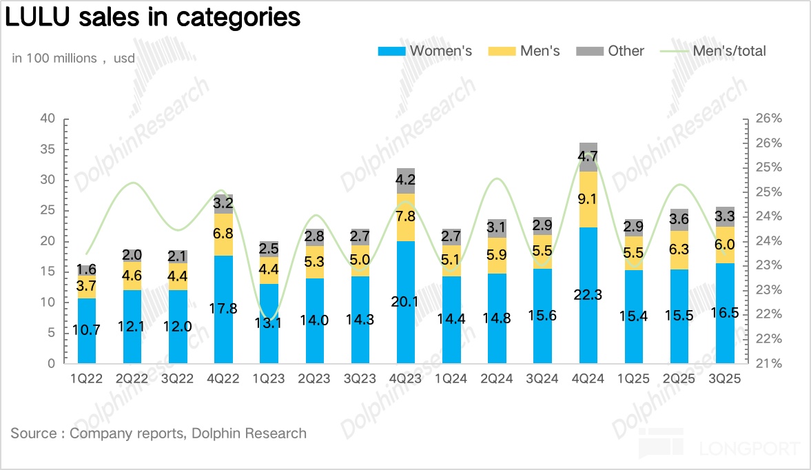 3、推新速度明显改善。从品类上看,核心主业女装实现营收 16.5 亿美元,同比增长 5.7%,略高于市场预期,海豚君推测Lululemon 在年初经过组织架构的调整,设计和商品部门协同性提升后在推新节奏明显改善,新品的贡献超出预期。男装实现营收 6 亿美元,同比增长 8.1%,趋势上看环比前两个季度略有提速,但并不明显。