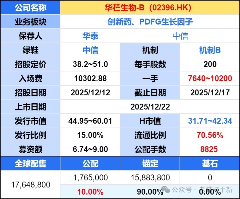 华仁是做生长因子类制药公司,定位不管烫伤还是糖足都是辅药,市场竞争激烈,基本面差,公配 9 千手是纯粹抽签票,华泰主保荐但中信绿鞋(一种神奇的结构),估值也不算太贵,医药题材支撑尚有力,可能有入通倾向,老猫评级给个 3-5 星!