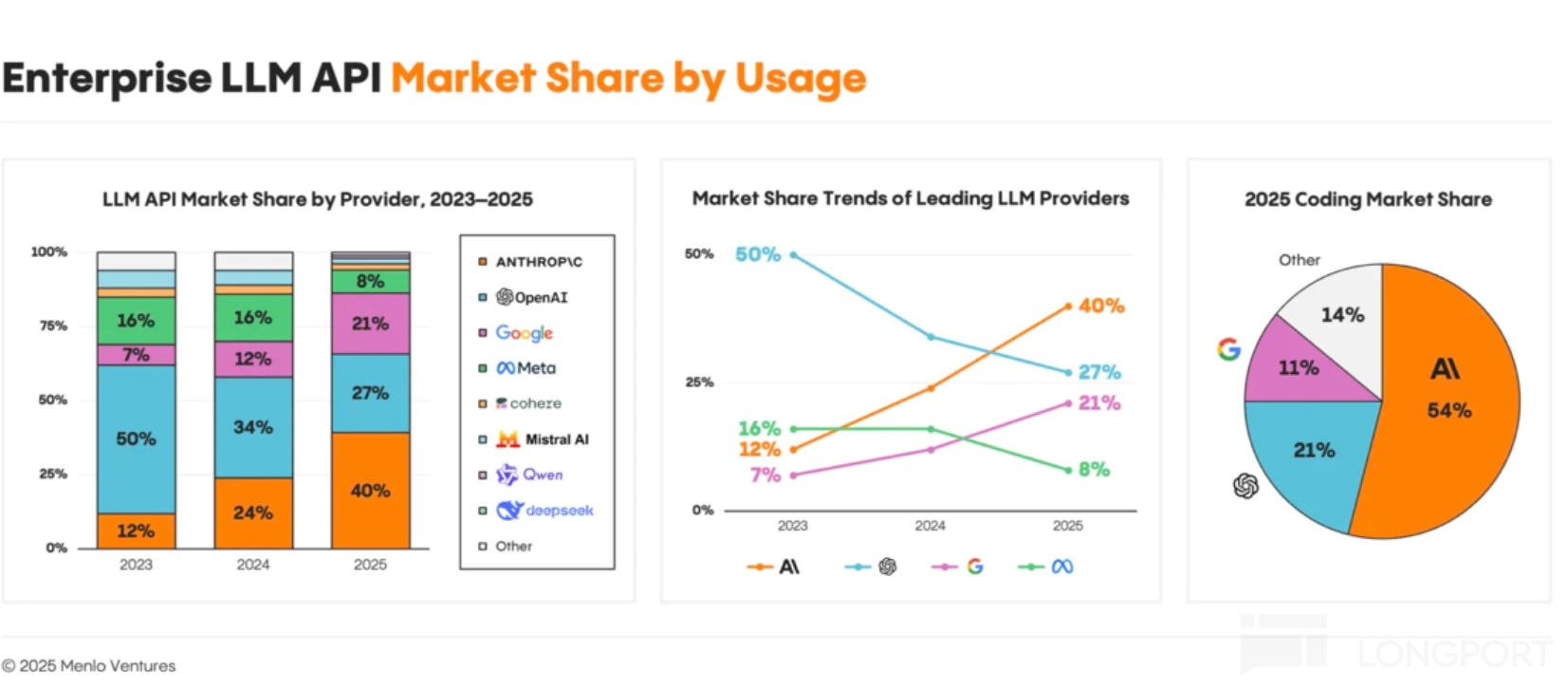 从目前的竞争趋势来看,在大模型的 API 接口服务上,2025 年 Anthropic 的市占率迅速,已经明显超过了 OpenAI。