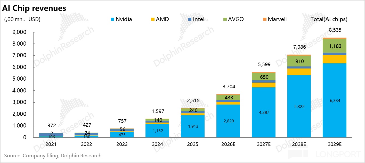 按目前市场现在对主流芯片设计商 2026 年的收入预期(AKA 云计算中心 AI 芯片 + 网络的采购支出),26 年 3700 亿美金的合计收入。大约对应云计算中心 26 年 6400 亿美金(也是目前的市场一致预期)的数据中心资本开支。