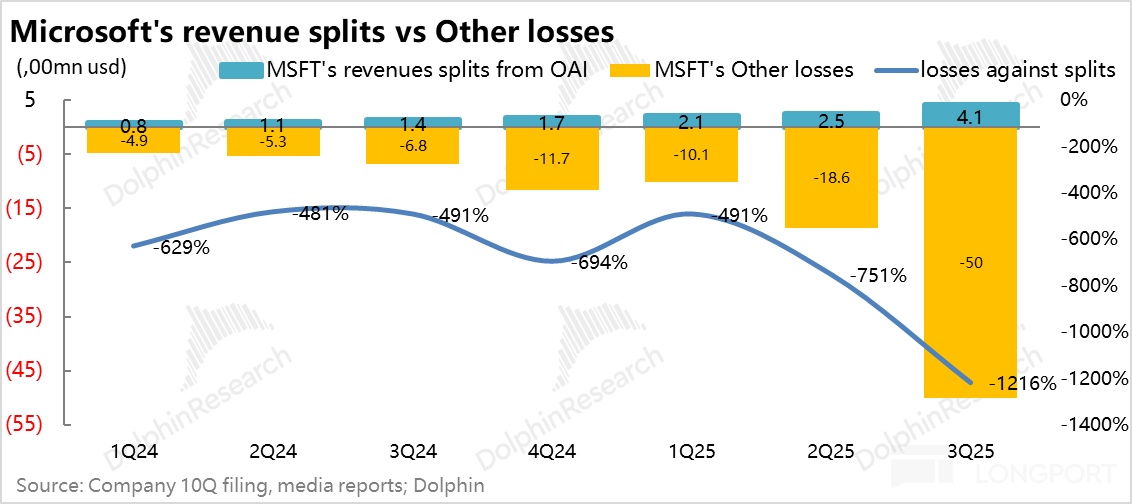 下图是海豚君从媒体报道中整理的微软从 OpenAI 的收入中拿到提升,假如该提成相对其收入规模比例关系保持稳定,同时三季度之前微软作为 40% 的股权拥有方,在 OpenAI 之前的亏损比例也保持稳定,那么微软因 OpenAI 亏损计入自己表内的亏损承担,相对比微软从 OpenAI 处获得的收入,能够一定程度上体现 OpenAI 的亏损率趋势。